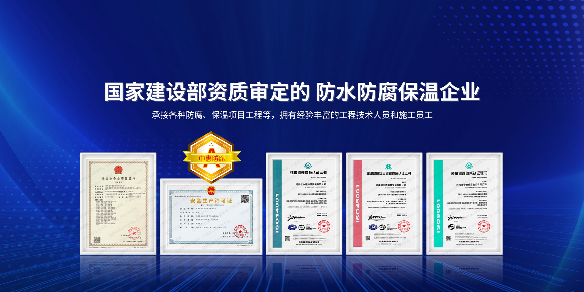 公司經營范圍:防水防腐保溫工程;消防設施工程;建筑裝修裝飾工程;建筑機電安裝工程;電力工程;建筑工程;石油化工工程;工業清洗工程;油罐清洗工程;鋼結構工程;環保工程;模板腳手架工程;電纜防火封堵、防污閃噴涂、外墻外保溫工程;各類施工勞務作業;設備維修、船舶鉚焊、涂裝;電力工程材料、建材、防水材料、防火材料、防腐保溫材料銷售,并相繼通過了GB/T19001-2008idtISO9001:2008GB/T50430-2007質量管理體系認證證書。GB/T24001-2004idtISO14001:2004環境管理體系認證證書。GB/T28001-2011idtOHSAS18001:2007職業健康安全管理體系認證證書。公司是中國防腐蝕于防護協會、中國施工企業管理協會、電力協會和中國鋼結構防水協會會員單位。 公司的經營業務涵蓋了石油、化工、電力、冶金、煤炭、船舶、國防、燃氣、水利、環保、交通運輸、航空及國防軍工和輕紡市政等行業的防腐保溫絕熱設備。鋼結構安裝、防火、防水、金屬噴鍍、聚脲噴繪、陰極保護、防滲透堵漏、玻璃鋼及各種磚版材料襯里、橡膠襯里、煙氣硫和耐酸溶劑腐蝕等工程施工。公司連續十年榮獲“省市先進施工企業”“安全生產先進單位”“重合同,守信用企業”和“AA***資質企業”的稱號。2000年被命名為市級文明單位,2002年被國家工商行政管理局命名為“重合同,守信用的企業”、被中國工業防腐蝕技術協會命名為“防腐蝕企業,能源節約及環境保護領域有豐富的經驗和***的業績。工程一次交驗合格率100%。其中攀枝花鋼鐵公司煉鐵廠四號高爐及熱風爐防腐工程、上海寶鋼公司煤氣柜防腐工程、撫順石油一廠裝置防腐項目、齊魯石化公司稀烴廠高塔防腐工程、吉林化學工業公司煉油廠油罐防腐工程、天津石化熱電廠六號爐頂棚聯絡管保溫工程、大慶油田(太倉)力神泵業工程、中國化學工程第十一建設工程、中原油田勘探局工程、中國石化銷售有限公司華北分部、魯皖輸油管道工程、貴州開磷息烽合成氨工程、陜西黃陵煤化工程、中國石油天然氣西部管道塔里木輸油工程、邯鋼集團邯寶鋼鐵公司煉鐵工程、德州供電工程、吉寶(南通)船廠工程,偃師華潤熱力工程、鄭州熱力總公司。 河南省中惠防腐安裝有限公司愿以豐富的施工經驗,***的技術,***的設備,***的管理,***的服務,竭誠為國內外廣大的用戶提供***滿意、******的工程作品。 我公司愿與國內外同仁一道,團結協作,共同推進防腐蝕行業發展! 公司地址:河南省長垣縣建設路北段360號 固定電話:0373-8866488 郵編:453400 網址:http://www_zhff_com_cn.jlqmj.com